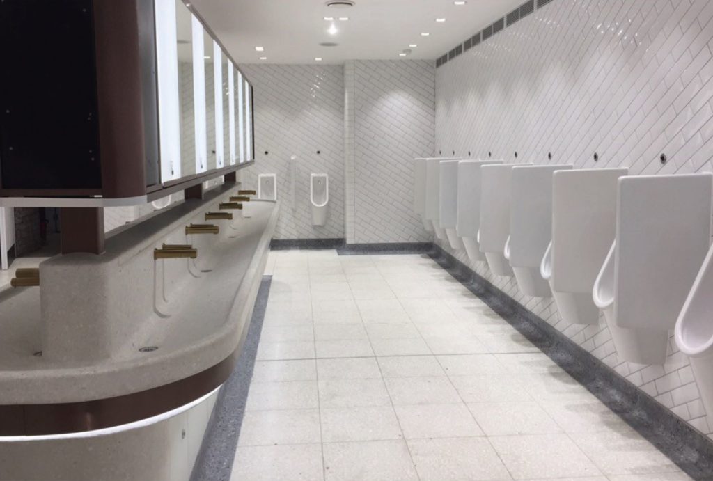 Andrews pre-cast units were installed at London’s busiest toilets as part of a major redesign and refurbishment of the facilities at Victoria Station. The manufacture of the bespoke sink troughs involved the design of complex moulding and a lot of hand finishing work by our skilled craftsmen. Andrews also supplied the pre-cast coved skirting which was oversized to add the contrasting grey border around the lighter tiled floor areas.
